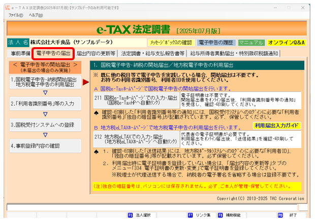 「電子申告の届出」タブでは、国税e-Taxホームページでの入力・届出及び地方税eLTAXでの入力・届出や、電子申告を行うための事前登録を行います。