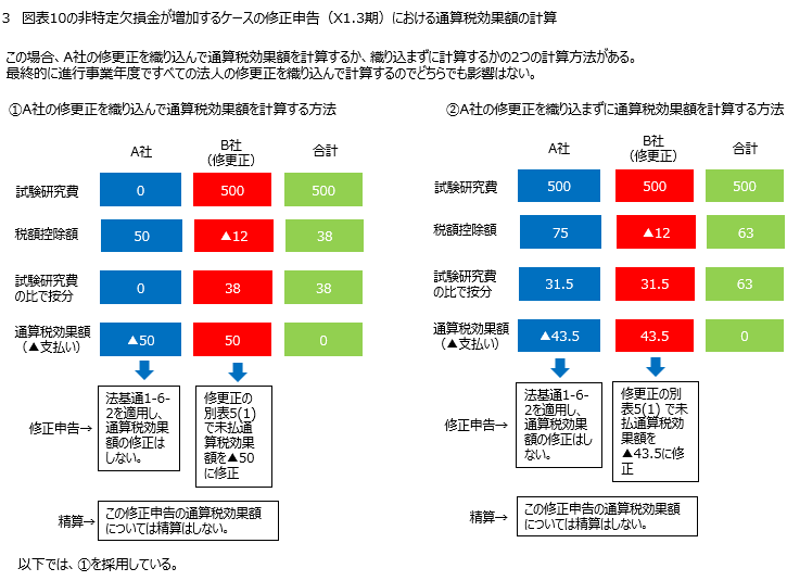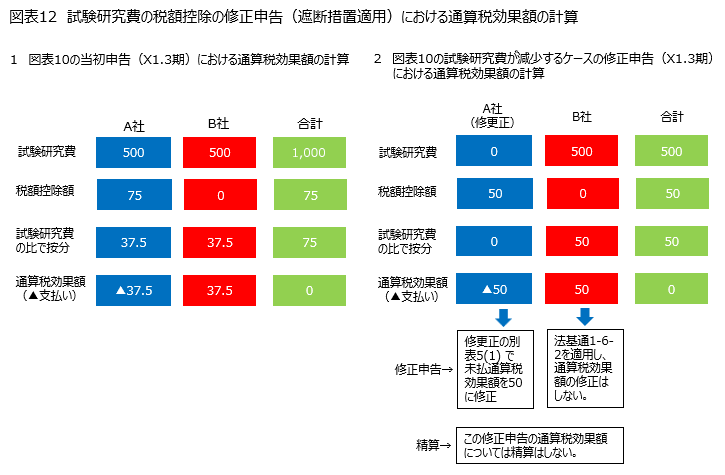 以上について、度を越す難しさがあると思うので、第3回で紹介した図表10及び図表11の計算例を使って、試験研究費の税額控除の修更正による通算税効果額(法人税分)の修正を示したい。