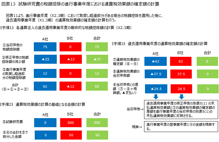 そして、「各通算法人の過去適用事業年度の最終的な税額控除額(①+③-②)の合計額を各通算法人の修更正後の一般試験研究費の額又は特別試験研究費基準額の比で按分して算出した金額」と「各通算法人の過去適用事業年度の最終的な税額控除額(①+③-②)」との差額に基づいて、本来あるべき通算税効果額を計算し、その差額を精算することが各通算法人の税負担の観点から理論的であると考えられる。