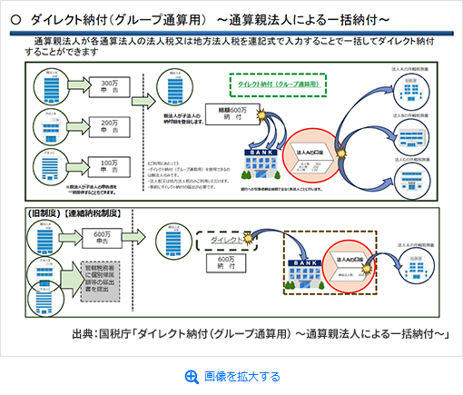 グループ通算制度では、通算子法人の法人税及び地方法人税の納付について、e-Taxを利用した納付(ダイレクト納付)により、通算親法人が一括で行うことが可能となっている(以下、この制度を「通算親法人の一括ダイレクト納付」という)。