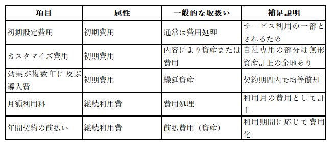 SaaSについては、「サービスの利用料」とみなされることから、資産ではなく費用として処理するのが原則です。初期設定費用や導入支援料も同様で、支出時に「支払手数料」や「通信費」などの科目で費用処理します。ただし、カスタマイズ費用については、自社システムと連携するために自社側でプログラムを開発し、継続利用する場合は「ソフトウェア」として資産計上することもあります。導入費が将来的に経済的便益を生む「資産性」が認められる場合は、「長期前払費用(税務上は繰延資産)」などの資産として計上し、契約期間等の合理的期間にわたって償却(費用化)する場合もあります。