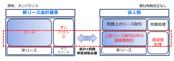 新リース会計基準においては、原則としてすべてのリース取引についてオンバランスすることになる一方で、法人税では、いわゆる現行のオペレーティング・リース取引に対して賃貸借処理が継続します。