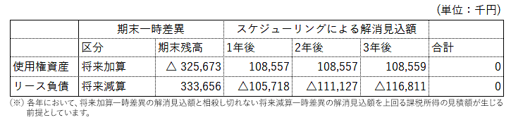 一方、リース負債に係る部分は「将来減算一時差異」となり、将来にわたって、リース負債の元本返済見込額を通じて解消していきます。