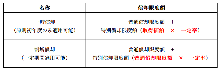「特別償却」は、その時々の政策的観点等から時限立法である租税特別措置法に規定されており、一定の場合に特例的に償却限度額を普通償却よりも大きくすること(損金の額を多く計上すること)が出来る制度です。