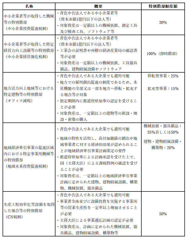 中小企業者等に対象企業が限定される特別償却も多いですが、地方に本社機能(事務所・研究所・研修所)の移転・拡充を行う場合等に適用可能な「オフィス減税」や、地域の特性を活かして高付加価値を創出する場合等に適用可能な「地域未来投資促進税制」、生産工程等の脱炭素化と付加価値向上を両立する設備を導入する場合等に適用可能な「CN税制」など、大企業でも適用可能な特別償却も多数存在しますので積極的に活用を検討してください。