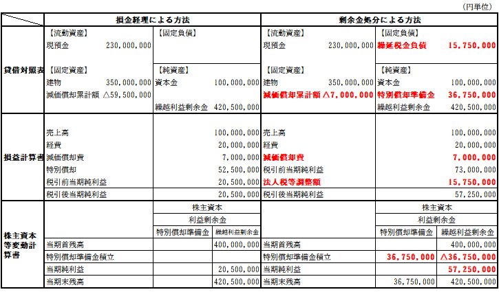剰余金処分方式の場合、特別償却の計上を減価償却費として損益計算書に計上するのではなく、貸借対照表上の純資産の部に計上します。