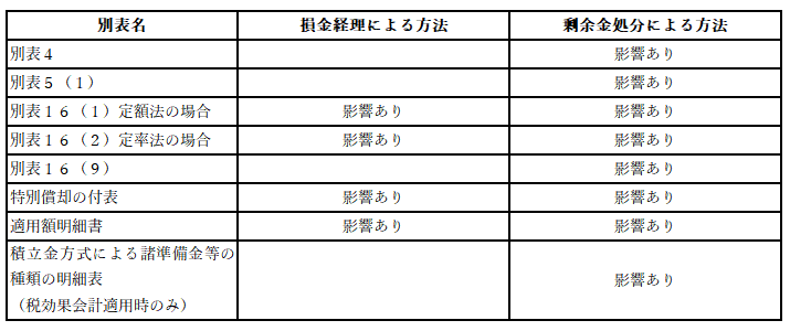追加入力・作成が必要となる別表・添付書類には「影響あり」と記載します。