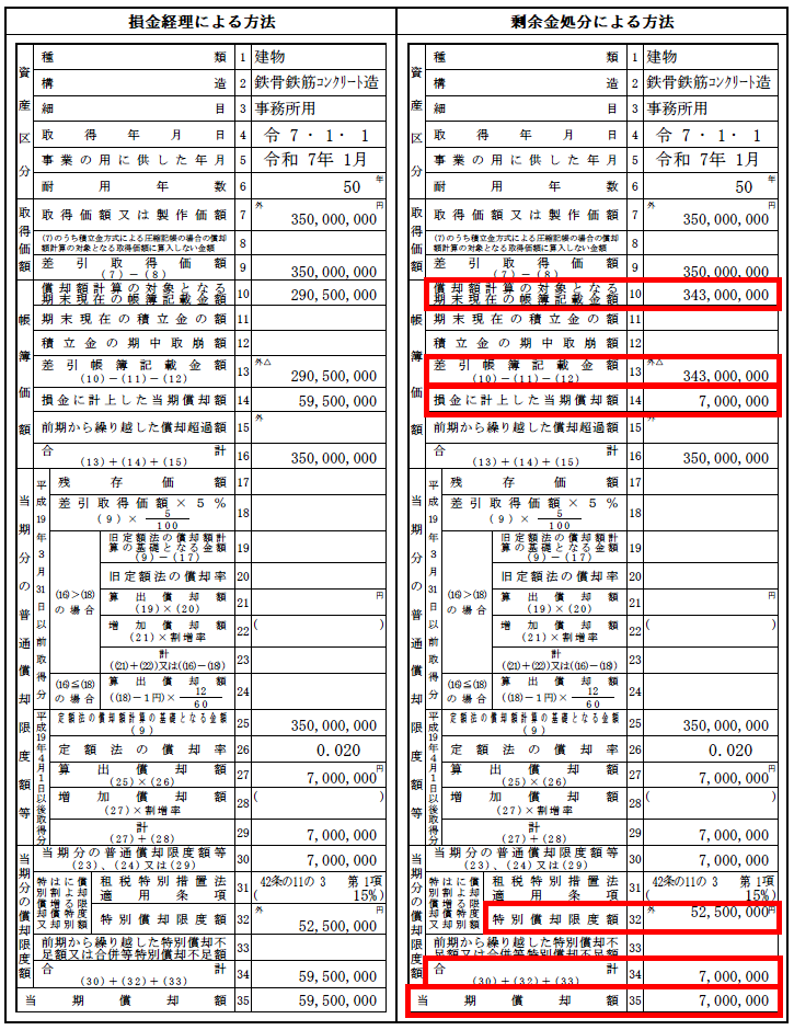 損金経理方式の場合は、特別償却部分も当期の減価償却費として損益計算書に計上しているため、普通償却と特別償却の合計額を14欄並びに35欄に入力します。