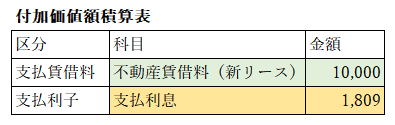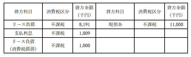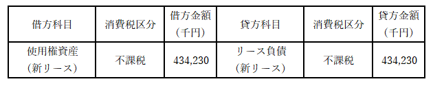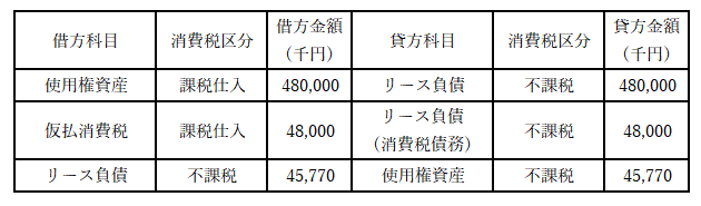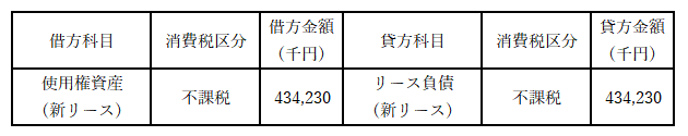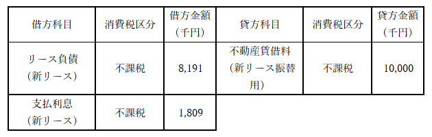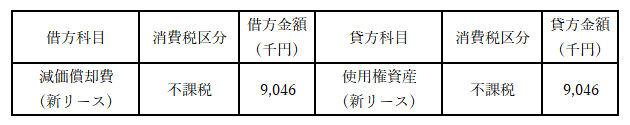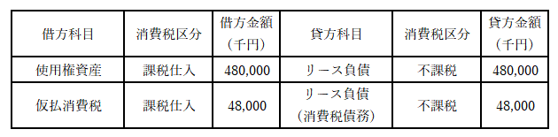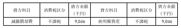 会計上は使用権資産が計上されますが、消費税法上は賃貸借取引が継続されるため、所有権移転外ファイナンス・リース取引契約での設例と異なり仮払消費税は計上されません。また、法人税法上は会計上計上した使用権資産、リース負債を取消す税務調整が必要となります。