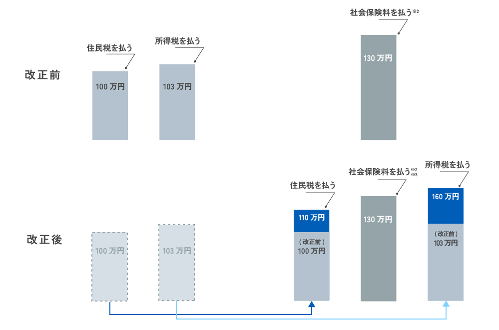 いわゆる「年収103万円の壁」が「年収160万円の壁」になります(+57万円)。