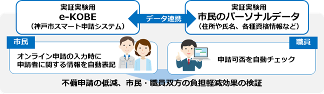 実証実験用「e-KOBE」に市民が保有する市民のパーソナルデータ(実験用データ)を連携して、オンライン申請時の「申請者に関する情報の自動入力」や「申請可否の自動チェック」等を行うことで不備申請の低減を図り、市民・職員双方の負担軽減効果を検証します。