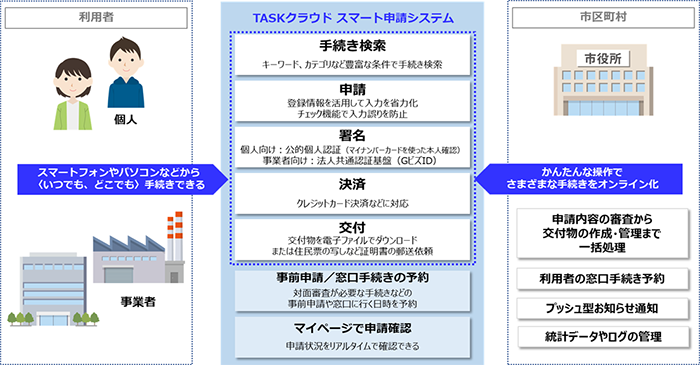 TASKクラウドスマート申請システムは、申請手続きに加えて、オンライン認証(署名)オンライン決済、オンライン交付――など、一連の行政手続きをオンライン上で完結し、「行かない窓口」の実現を支援するクラウドサービスです。