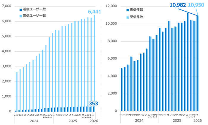 令和8年1月(単月)で、TKCのPeppolアクセスポイントにおいて353社が10,982件のペポルインボイスを送信しています。また、同アクセスポイントにおいて6,441社が10,992件のペポルインボイスを受信しています。