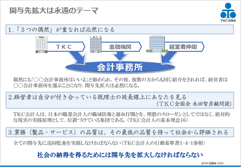 つまり、起票代行をせず、税の誤魔化しを許さず、TKCシステム一本で、月次巡回監査を断行し、「会計で会社を強くする」ことが重要なのです。そうして社会の納得を得ながら、関与先拡大をしていくことが大切であるとお伝えしたいと思います。