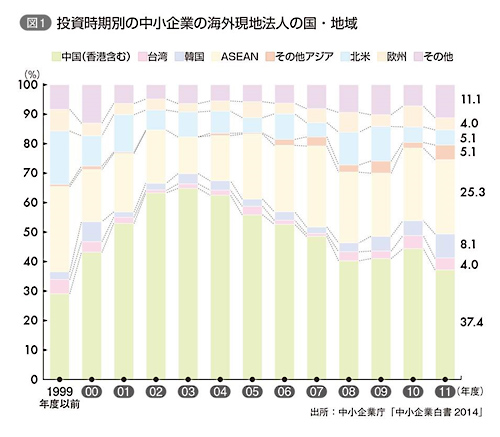 中小企業の東南アジア諸国連合(ASEAN)への進出が目立っている。「中小企業白書2014」によると、2011年度におけるアセアン地域での現地法人数は全地域の25.3%に達した(図1参照)。これは中国の37.4%に次ぐ数字である。日系企業の相次ぐ撤退が見られる中国とは対照的に存在感を強めている理由は何だろうか。