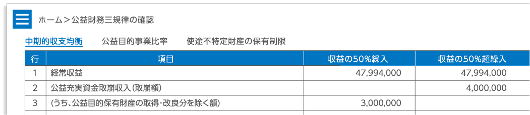 公益法人特有の法人充足要件である「中期的収支均衡」「公益目的事業比率」「使途不特定財産の保有制限」を確認できます。