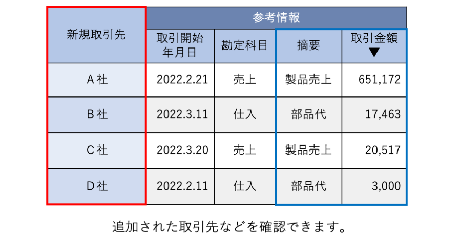 仕訳データをもとに自動生成された新規の科目、部門、取引先を確認できます。