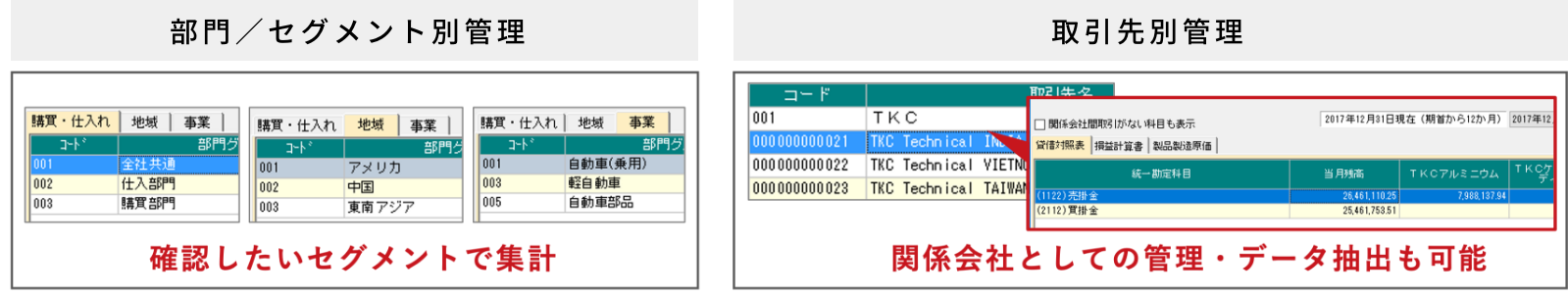 勘定科目や現地取引先ごとの取引金額合計、取引件数、取引金額平均値をもとに