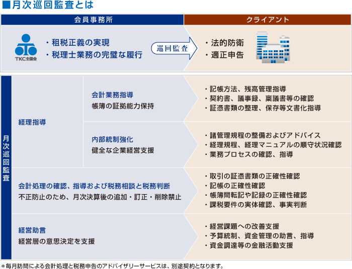 TKC全国会会員が実践する巡回監査とは、毎月および期末決算時に企業を訪問し、会計資料ならびに会計記録の適法性、正確性および適時性を確保するため会計事実の真実性、実在性、網羅性を検証し、かつ経営助言を行うものです。