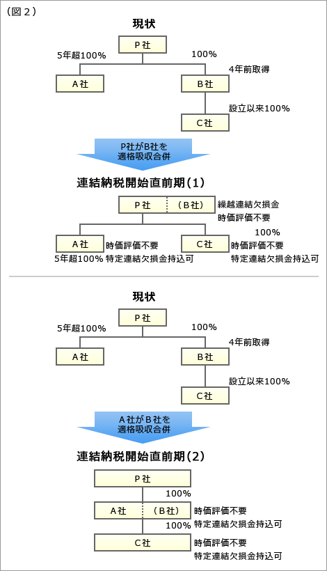 時価評価が必要となる資産を有する子法人(B社)が、親会社と適格合併すれば、その資産は当然ですが、時価評価の対象外となりますし、欠損金があれば親会社の欠損金として連結納税に持ち込むことができます(図2)。また、親会社が5年超保有している子会社(A社)とB社が適格合併すれば、B社の資産は時価評価不要となりますし、欠損金は特定連結欠損金として連結納税に持ち込むことができます。