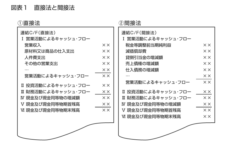 連結キャッシュ・フロー計算書の中で、営業活動によるキャッシュ・フローは、図表1のとおり直接法と間接法という2種類の表示方法があります。直接法とは主要な取引ごとに収入、支出を表示する方法です。また、間接法とは純利益に調整項目を加減して表示する方法です。直接法は全ての取引から営業取引に該当する収入、支出を集計しなければならないため作成作業は煩雑になります。よって、実務上は間接法を採用することが一般的です。