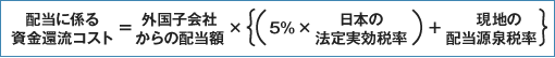 外国子会社から日本の親会社に対して配当が行われた場合、日本の親会社では外国子会社配当益金不算入の適用により配当額の95%が免税となります。したがって、資金還流コストは、次の通り、配当額の5%部分に日本の法定実効税率を乗じた金額、及び、現地での配当源泉税、の合計額になります。