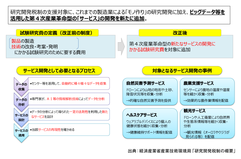 従来の試験研究費の範囲からは主に製造業を対象とした税制となっていましたが、平成29年度税制改正でIoT、ビックデータ、AI等を活用したいわゆる「第4次産業革命型」の新サービスの開発にかかる費用が試験研究費の範囲に追加され、適用業種の拡大が図られています。(措法42の4⑧一、措令27の4②③、措規20①②)