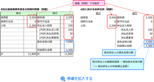 税務上も、適格合併に該当するため、A社はB社の資産および負債を簿価で引き継ぎますが、引き継ぐべき簿価は税務上の簿価です。また、A社はB社の合併直前の資本金等の額および利益積立金額を引き継ぐことになります。