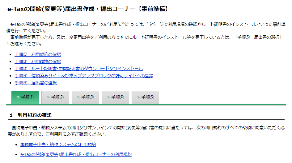 - ②「e-Taxの開始(変更等)届出書作成・提出コーナー【事前準備】」では、表示の手順に従って「手順① 利用規約の確認」「手順② 利用環境の確認」「手順③ ルート証明書のインストール」及び「手順④ 信頼済みサイトへの登録」を行ってください。 (注) ルート証明書が既にインストールされている場合は、再度インストールする必要はありません。ルート証明書がインストールされているかどうかは「ルート証明書のインストールの有無を確認する方法」をご確認ください。