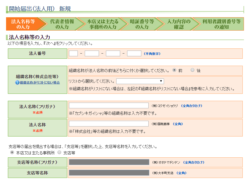 - ③「手順⑤ 届出書の選択」で「【届出書の選択】へ」をクリックすると、「個人の方」「法人の方」「税理士の方」「税理士法人の方」の画面が表示されますので、「法人の方」を選択します。画面に従って法人名称などの届出事項や暗証番号を入力の上、送信ボタンをクリックします。送信後すぐに、「利用者識別番号」及び「暗証番号」が表示されますので、必ず印刷又は保存してください。「利用者識別番号等の通知」画面は一度閉じてしまうと、再表示はできませんので、印刷又は保存を失念することがないよう、ご注意ください。 なお、電子申告開始届出書を書面提出した場合には、税務署から「利用者識別番号等の通知書」が送付されるのに1週間以上かかります。期限の余裕をもって手続きしてください。