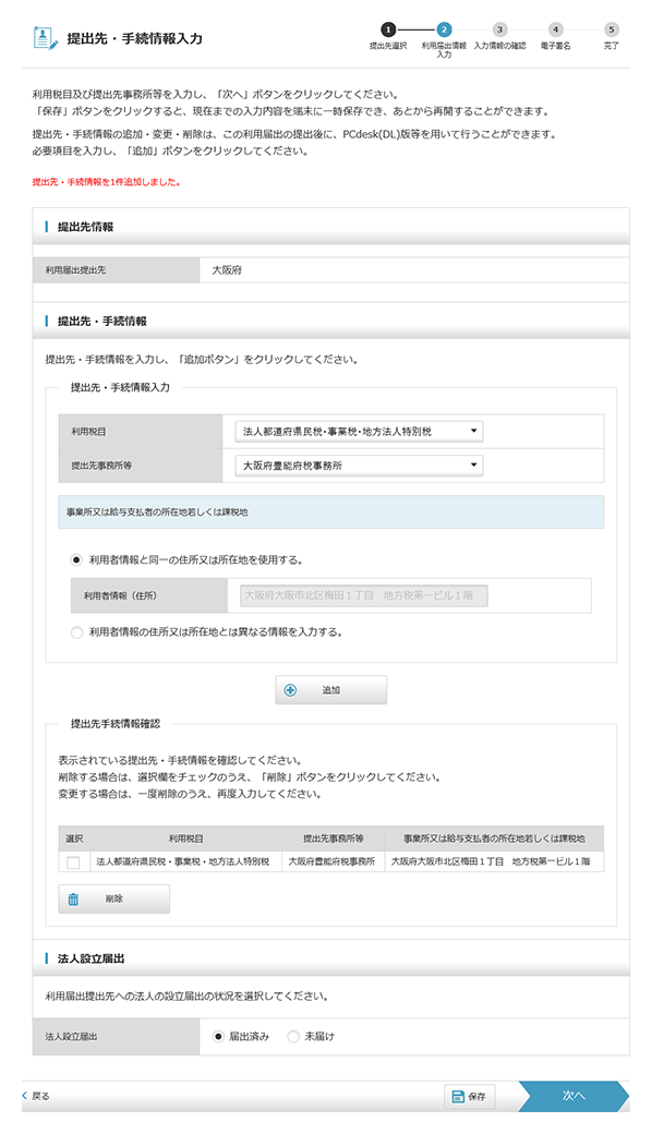 - ③「利用者情報入力(法人)」画面が表示されますので、法人の基本情報を入力します。次に「提出先・手続情報の入力」画面で利用税目や提出先事務所等に関する情報を入力し、「次へ」をクリックします。 なお、「追加」をクリックすると、複数の利用税目や提出先事務所等に関する情報を追加登録できます。