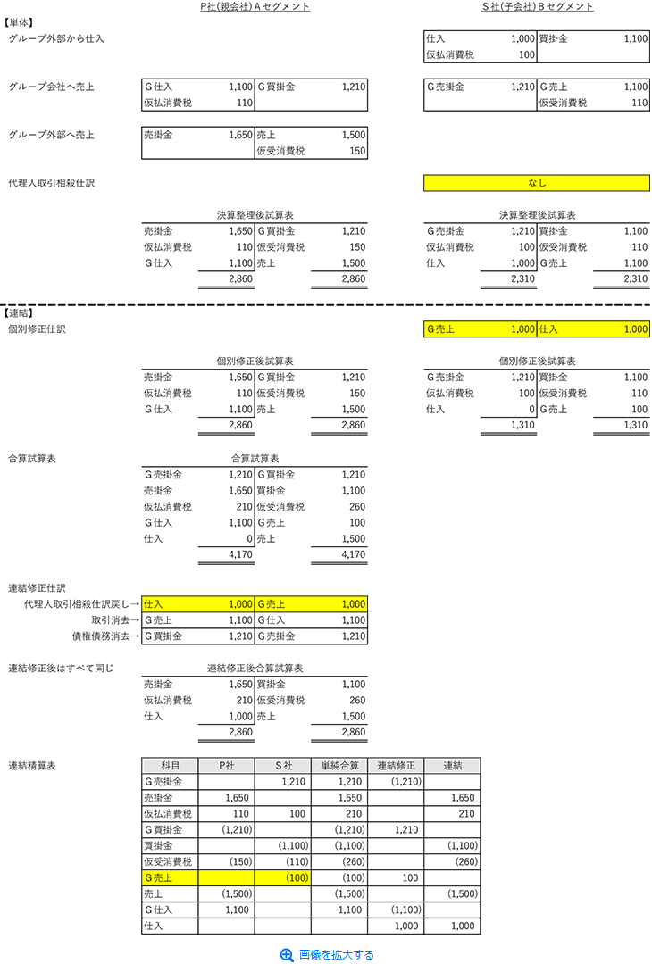 単体決算で代理人取引を反映し、代理人取引相殺仕訳を連結修正仕訳で戻す