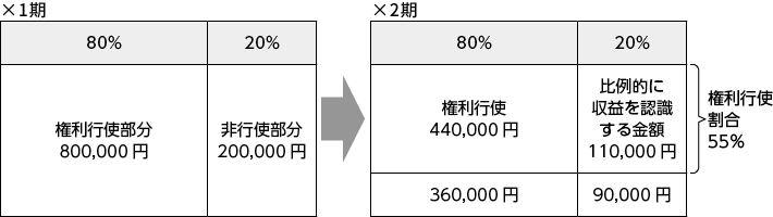 ×2期末の非行使部分のうち権利行使分(未行使部分560,000円のうち、非行使部分の金額(※1)に権利行使割合55%(※2)を乗じた額110,000円(※3))を収益認識します。