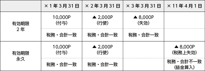 ただし、法人税法では、自社ポイントの未行使部分の取扱いにつき、商品券等の取扱いに準じた規定が適用されるため、原則として、10年を経過する日の属する事業年度終了の時において、未行使部分に係る対価の額のうち、いまだ益金の額に算入されていない部分は一括して益金の額に算入することになります。一方、収益認識基準では、このような取り扱いがなく、収益の額と益金の額の計上時期が異なるため、申告調整及び税効果の対象となります。