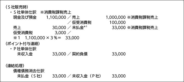 親会社P社はP社ポイント発行主体で、1ポイント1円で利用できるグループ共通ポイント制度を運営しています。付与されるP社ポイントは、P社のグループ企業内で利用できます。子会社S社は×1期に顧客に商品を1,100,000円(税込)で販売するとともに、販売代金(税込)に対してP社ポイント3%を付与しました。