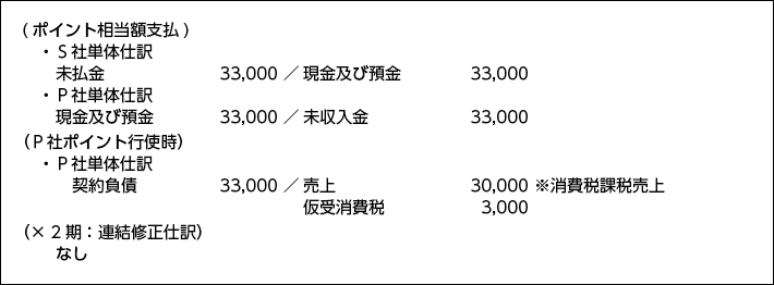 ×2期に、S社はP社にポイント相当額を支払いました。後日、ポイントが行使されP社は顧客に33,000ポイント相当額の商品33,000円(税込)を引き渡しました。なお、グループ他社が付与した自社ポイントについて、連結上は自社ポイントと考えられますが、連結上の調整は省略しています。