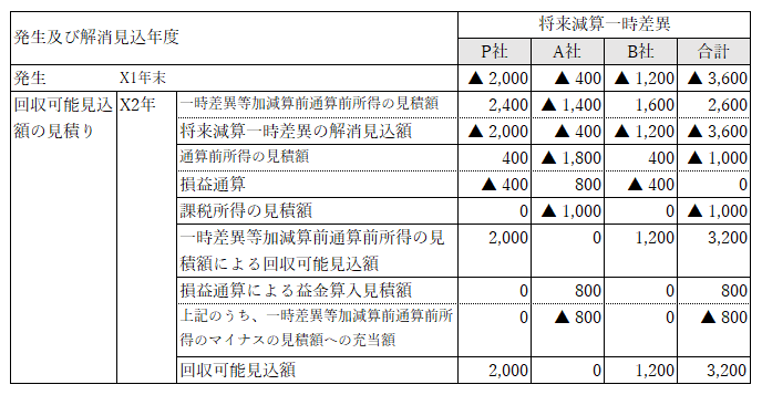 - 個別財務諸表における繰延税金資産の回収可能性の判断にあたっては、個社の一時差異等加減算前通算前所得の見積額に加えて、他の会社の通算前所得との損益通算を加味して回収可能性の判断を行うこととなる。具体的には、まず、個社の一時差異等加減算前通算前所得に基づき、P社とB社においては回収可能となるが、A社においては、個社の一時差異等加減算前通算前所得が▲1,400であり全額が回収できない。また、損益通算によってP社とB社の通算前所得合計800と通算されるが、損益通算による益金算入見積額800をA社の一時差異等加減算前通算前所得▲1,400に充当した残額は▲600となることから、A社において全額が回収不能となる。