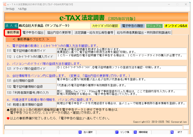 「事前準備」タブでは、電子証明書やICカードリーダライタの準備、ドライバの登録及び電子申告に必要な基本情報の入力を行います。電子証明書の取得方法など、各手続きのガイドも掲載されています。