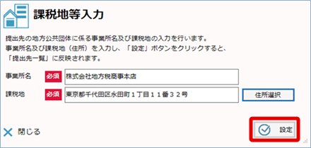 3)「提出先選択」から追加したい提出先・申告税目を選択し、「追加」をクリック → 「提出先一覧」に追加されますので、「課税地入力」をクリックし、 「事業所名」及び「課税地」を入力し、「設定」をクリック → 「提出先・手続き一覧」に提出先が反映されていることを確認し、「次へ」をクリックします。「利用届出送信結果一覧」が表示されますので、電子申告先の登録が完了したことを確認してください。