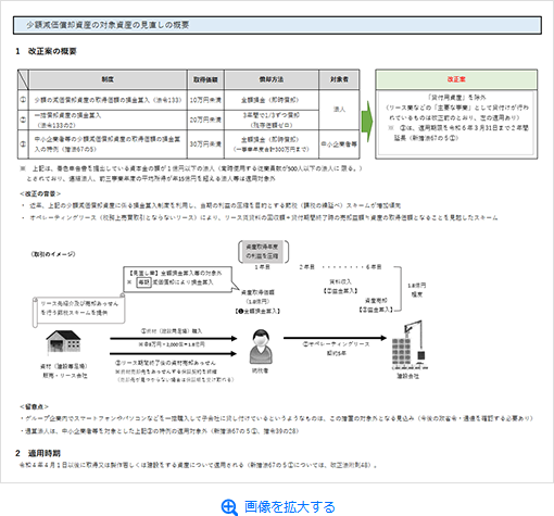 少額減価償却資産の対象資産が次の図表の「改正案」にあるように見直されます。