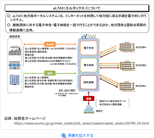 eLTAX(地方税のオンライン手続のためのシステム)を通じた電子申告・申請の対象手続や電子納付の対象税目・納付手段が拡大され、更なるデジタル化が促進されます。