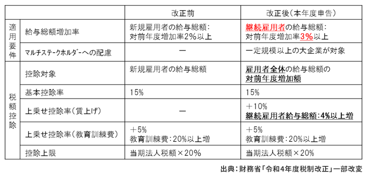 令和4年税制改正においては、適用要件の判定ルールが、新規雇用者の給与総額の増加率から継続雇用者の給与総額へと変更になっていることが特徴です。賃上げ幅の多い法人に対してはさらに控除率の上乗せ措置も追加され、最大で30%の控除率となります(措法42の12の5①)。
