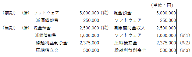 - 国庫補助金の申請を行い、目的資産であるソフトウェア5,000,000円(耐用年数5年、定額法)を取得した。また当期に当該資産の減価償却費として250,000円を計上した。