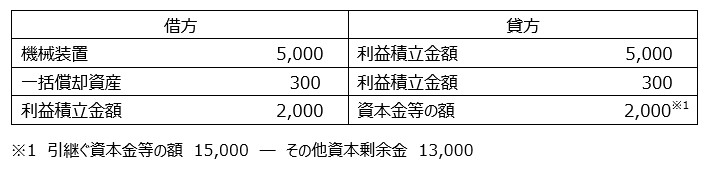 完全支配関係がある兄弟会社間での適格合併を前提とします。会計上は、以下のような受入仕訳が切られました。機械装置には、繰越償却超過額が5,000あり、一括償却資産300はオフバランスで処理されています。合併法人では、機械装置の減価償却方法について定率法を採用しています。