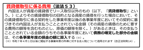 具体的には、現行のリース会計基準におけるオペレーティング・リース取引により資産の賃借を行った場合、契約に基づき支払う金額があるときは、債務の確定した部分の金額は、その事業年度の損金の額に算入することになります。