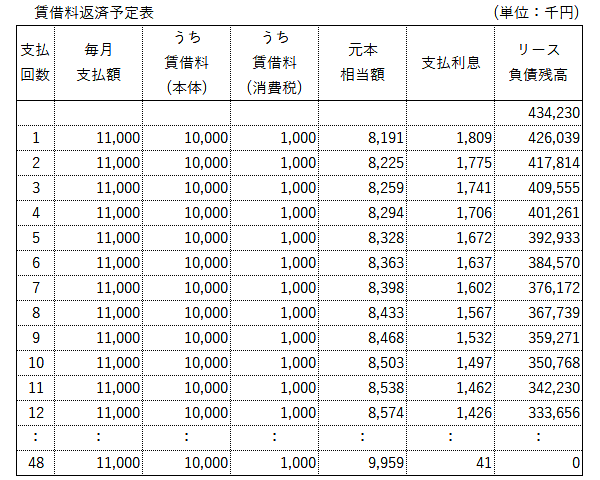 月額賃借料は11,000千円(税込)で、4年間金額に変更はなし。消費税率は10%とする。