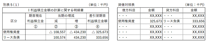 使用権資産とリース負債の差引翌期首利益積立金額は、それぞれ貸借対照表の残高と一致します。また、両者の残高の差異として7,983千円が発生していますが、この金額は会計上の費用の額と法人税法上の損金算入額の差額と一致します。