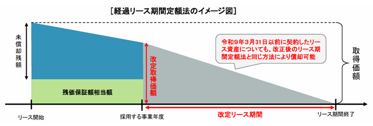 新リース会計基準は令和9年4月1日以後に開始する事業年度から強制適用となりますが、令和7年4月1日以後に開始する事業年度から早期適用も可能です。このため、令和9年3月31日以前に締結されたその取得価額に残価保証額に相当する金額が含まれるリース資産(経過リース資産)は、法人税法上、リース期間定額法に代えて、経過リース期間定額法を採用することができるようになりました。