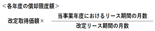 経過リース期間定額法では、経過措置を適用する事業年度の期首帳簿価額を改定取得価額、未経過リース期間を改定リース期間として償却を行います。