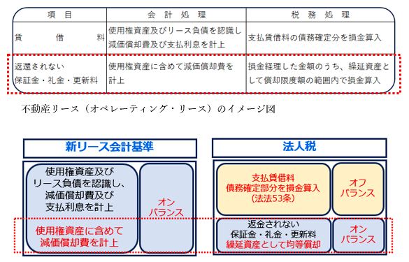 法人税法においてオペレーティング・リースは従来通り賃貸借処理(オフバランス)とされ、支払賃借料のうち債務が確定した部分が損金算入されます。(法人税法第53条)